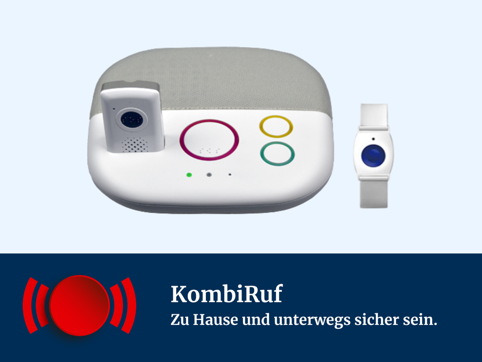 Der KombiRuf des Deutsches Rotes Kreuz erweitert dieses Prinzip um eine mobile Nutzung. Er funktioniert nicht nur zuhause, sondern auch unterwegs, da er über eine integrierte Mobilfunkkarte verfügt und keinen Festnetzanschluss benötigt. Zusätzlich kann das Gerät im Notfall per GPS geortet werden, sodass Hilfe gezielt zu Ihnen geschickt werden kann.